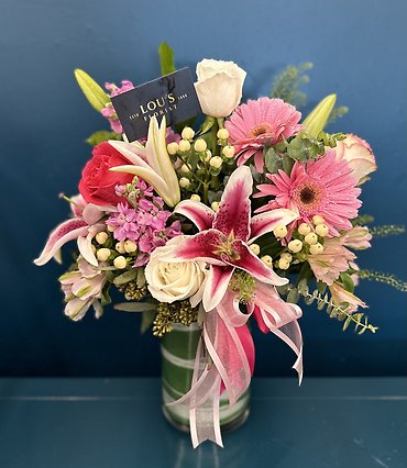 The Loving Thoughts Bouquet blushes with the warmth and beauty of a Mother's love and grace. Brilliant roses and lilies are offset by stock and lush greens delicately arranged in a glass vase to create a wonderful expression of gratitude and affection. SUBSTITUTES MAY APPLY DEPENDING ON AVAILABILITY, VASES, FLOWERS ETC.